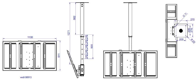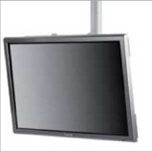 Universal ceiling mount bracket, adjustable and tiltable, steel made. The bracket consists of 3 parts: fixing system on the ceiling, controlled inclination system (Tilting System) and the Universal frame. To fix on the ceiling there are four holes Ø11mm in the flange on top of the tube. In the bottom of the tube here is the Tilting System. This kind of system allows to rotating a +20° or -10° angle of inclination, using an exagonal key in the equipment. It is also possible to rotate the system around the vertical axis for 360°. The “Maxi” frame (1100x661mm) is compatible with holes on wheelbases from 74-406mm and 594-1000mm in horizontal and from 80 to 465 in vertical. The telescopic arm grants to regulate the central part of the monitor at the height from 75 to 125cm. Its possible to adjust the height of the monitor with 10cm steps. It is necessary to work in safetely conditions to use two M6 screws on the base of the frame. The tubes are drilled to make the cable’s passage is possible inside the bracket. Time to assemble the stand: 5 minutes.