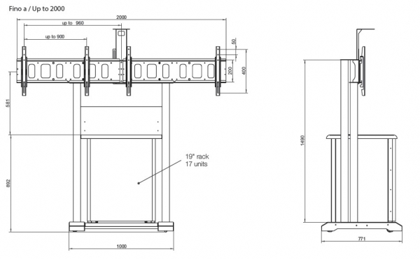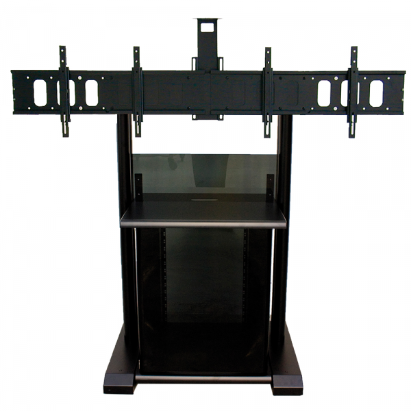 Ha in dotazione un ampio ed elegante rack 19” da 17U con copertura in plexiglas in cui alloggiare tutti gli apparati necessari per la corretto utilizzo dei due monitor. Questo supporto è stato dotato di agganci e di un sistema di ancoraggio innovativo che facilita in maniera estrema la collocazione dei singoli monitor sulla struttura. Questo supporto è stato dotato di ruote e realizzato con dimensioni studiate appositamente per permettere un facile trasporto all’interno di qualsiasi ambiente.