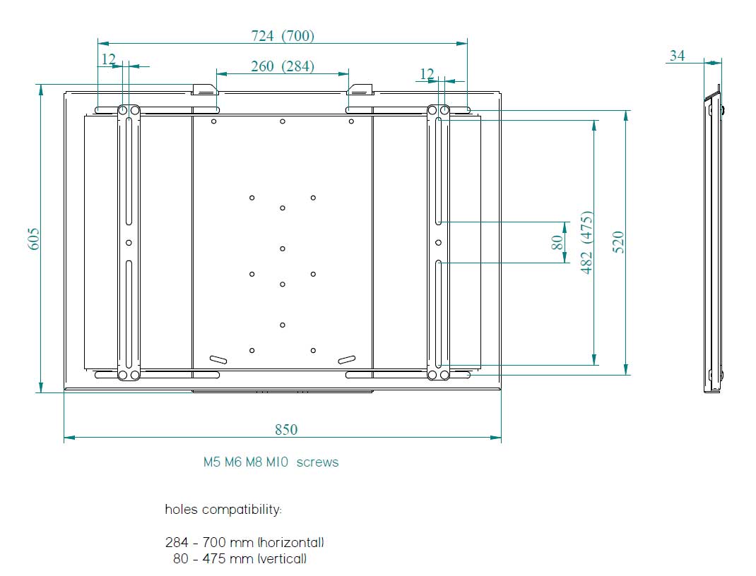Supporto Plasma fisso da parete “universal”, realizzato in lamiera d’acciaio. Il supporto è composto da due piastre: la prima da fissare a parete (365x605mm), e l’altra da fissare al monitor (850x590mm). La compatibilità con tutti i modelli e marche di plasma (da 42” a 55”) è garantita dal “sistema ad asole scorrevole” che coprono un interasse orizzontale 284-700mm e verticale 80-475mm. Grazie a tale sistema una volta fissato il plasma, lo si può centrare per evitare che la piastra a parete sia visibile. In dotazione vengono forniti 6 piastrini “jolly” con foro per viti M5-M6-M8-M10 che agiscono come centratura della vite di fissaggio con il plasma. Il distanziale in PVC garantisce l’isolamento del supporto rispetto al plasma. Nella parte inferiore sono state inserite due viti di sicurezza per scoraggiare tentativi di furto del plasma stesso. In dotazione vengono fornite anche 6 viti M5-M6-M8-M10. Tempo di montaggio del plasma a parete: 5 minuti.